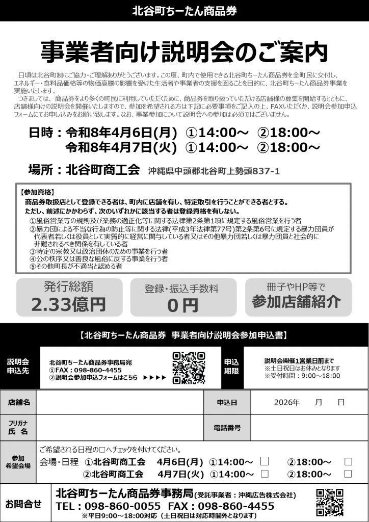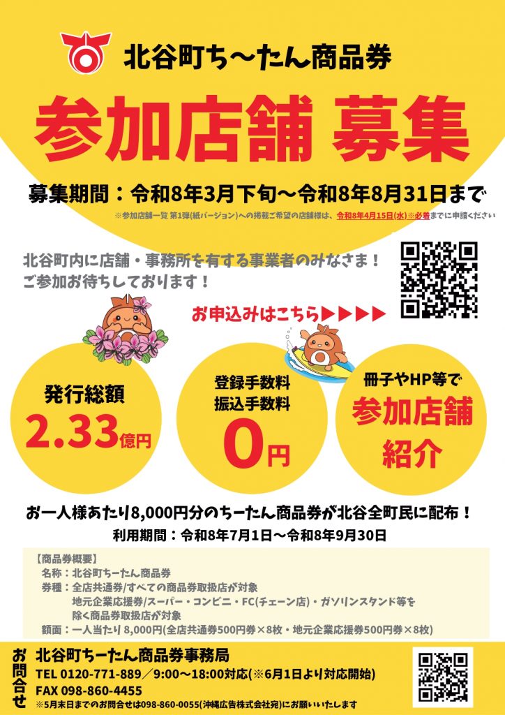 北谷町では物価高騰の影響を受けた生活者や事業所の支援を図る目的にちーたん商品券を全町民に交付されます。