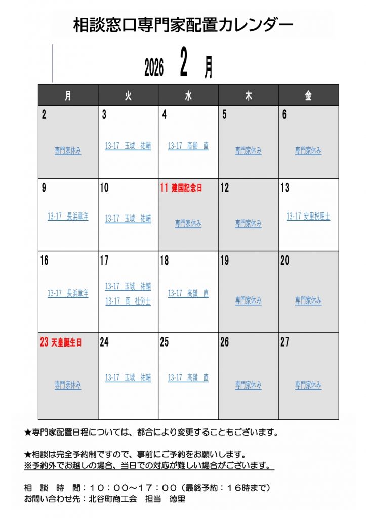 北谷町商工会 2月の専門家相談の日程が確定いたしました。