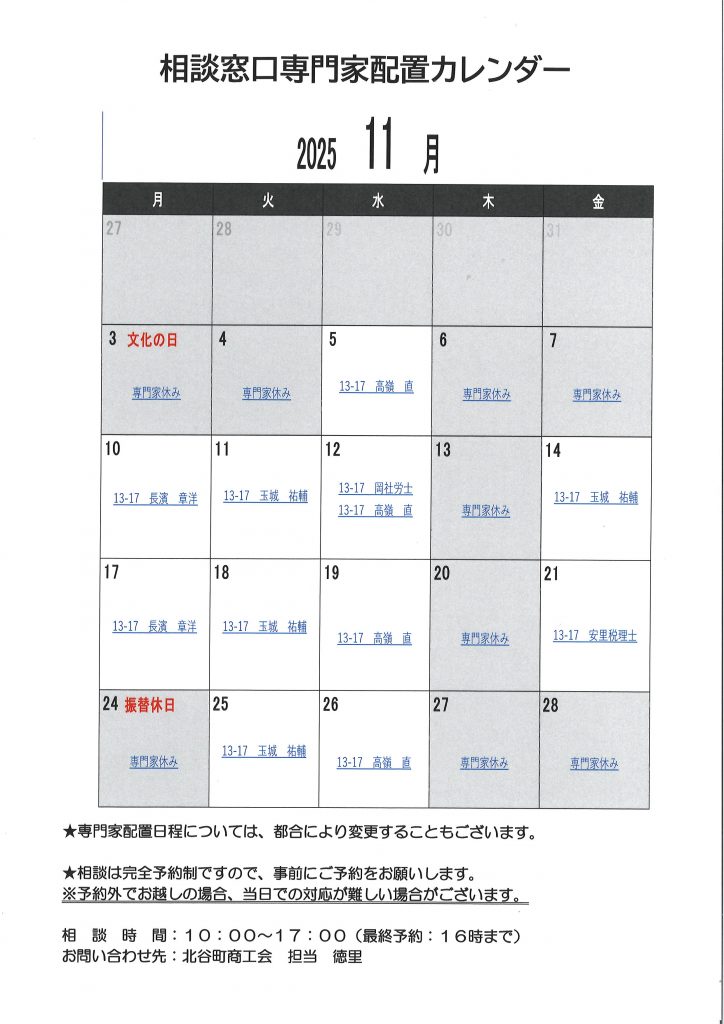北谷町商工会 11月の専門家相談の日程が確定いたしました。