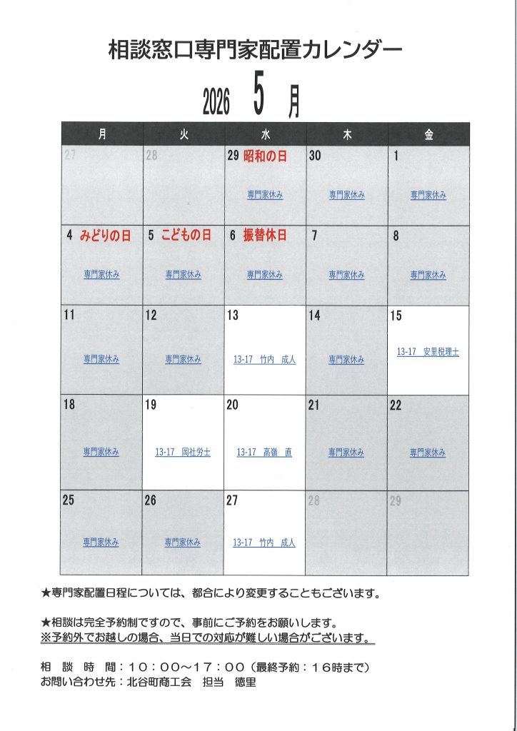 北谷町商工会5月の専門家相談の日程が確定いたしました。