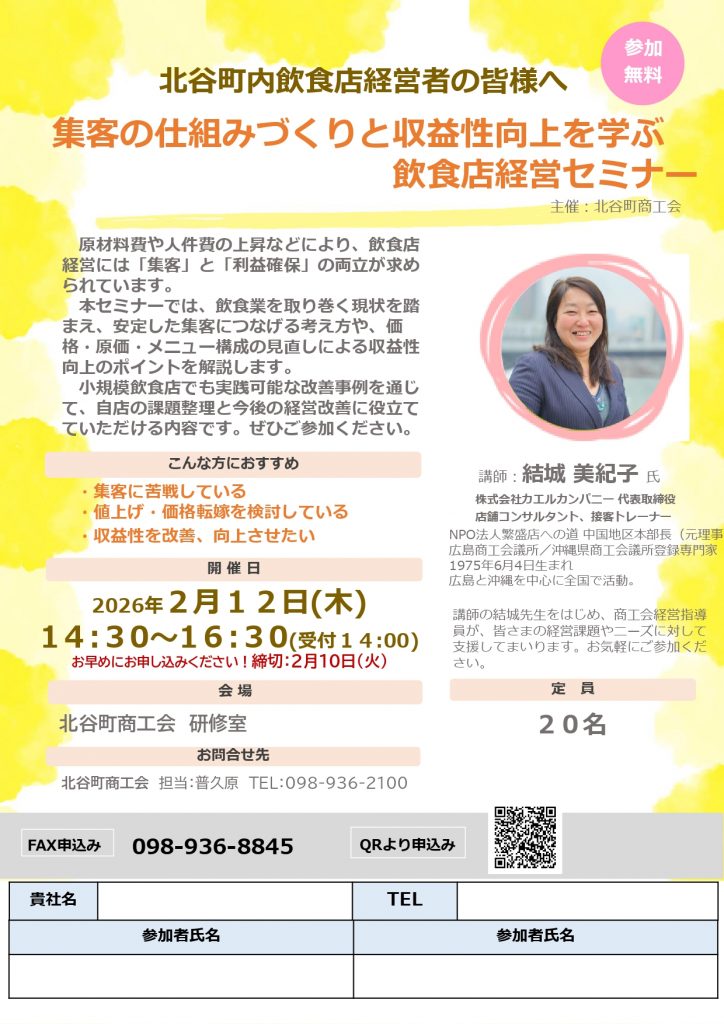 原材料費や人件費の高騰が続く中、飲食店経営には「集客」と「利益確保」の両立が求められています。本セミナーでは、飲食業を取り巻く現状を踏まえ、安定した集客につなげる考え方や、価格・原価・メニュー構成の見直しによる収益性向上のポイントを分かりやすく解説します。
