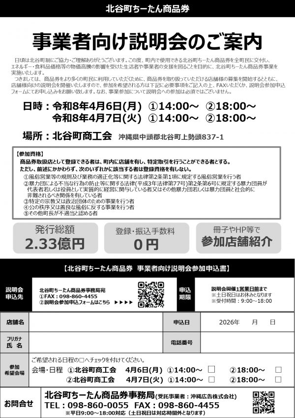 こちらの件に関するお問い合わせは北谷町商工会ではなく下記になります。